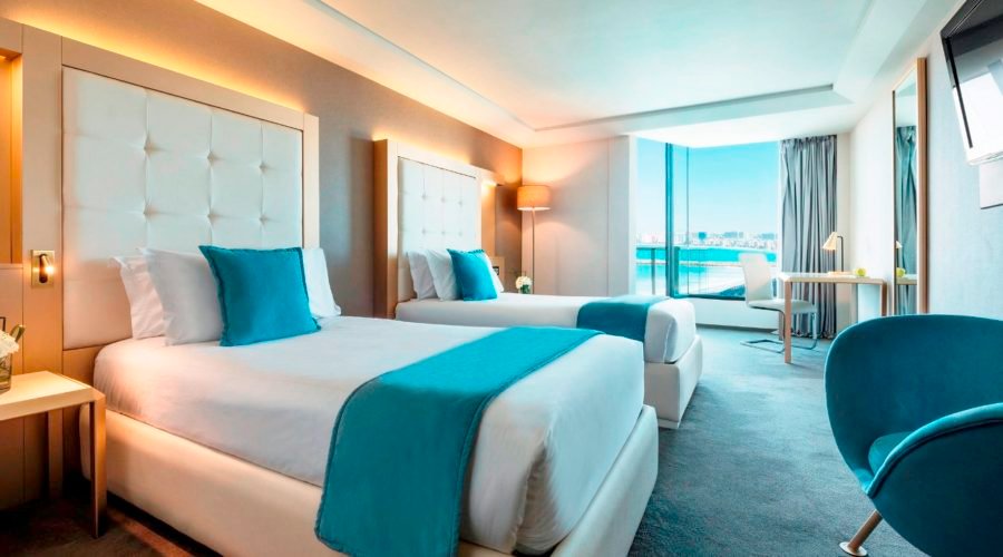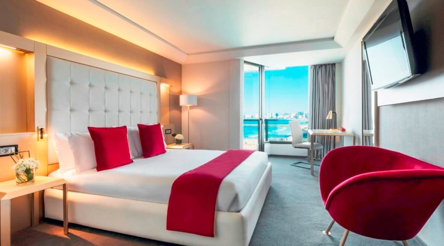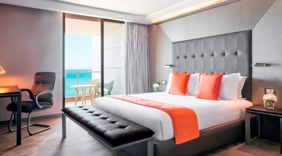 Chambre Premium avec lit King et vue partielle sur la mer, grand lit, wifi gratuit, tv, minibar, balcon et vue sur le jardin et la mer.